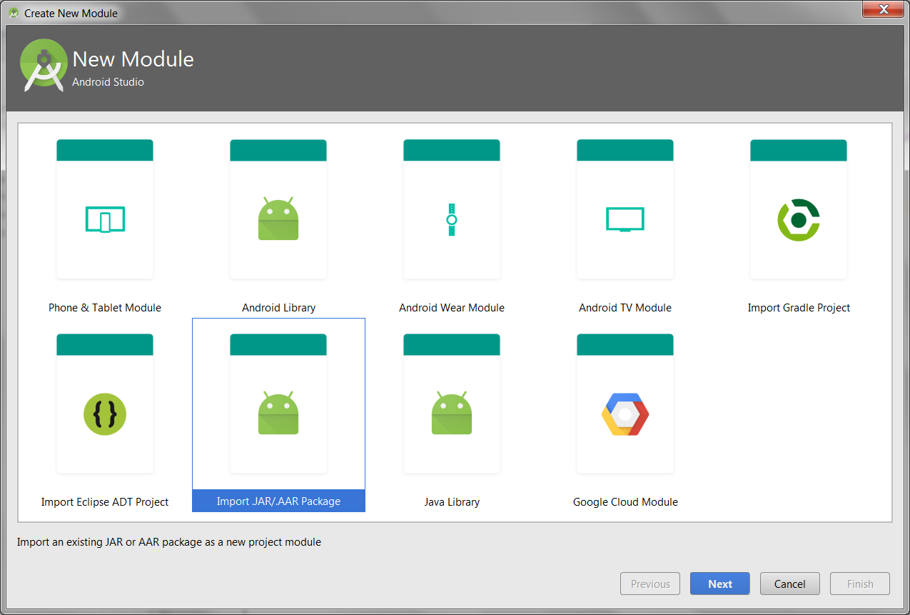 - In Android Studio, choose File → New → New Module → Import JAR/AAR Package. Click Next and select the downloaded file CedatSTT.aar.