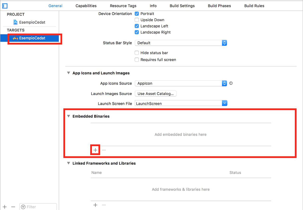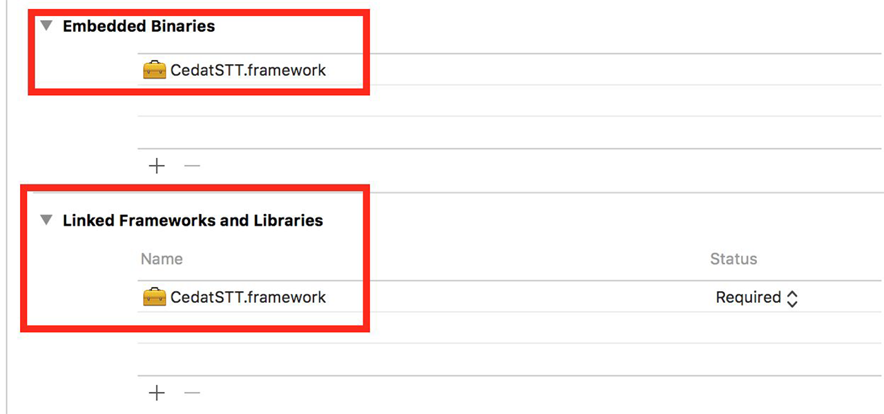 - In Xcode, choose the project and select your target. Then in Tab Embedded Binaries click on the + button, select Add Other and choose the downloaded file CedatSTT.framework. Verify that Copy items if needed is checked and click Finish.